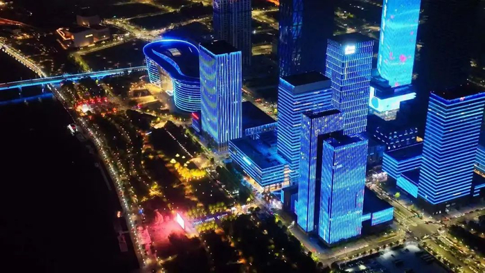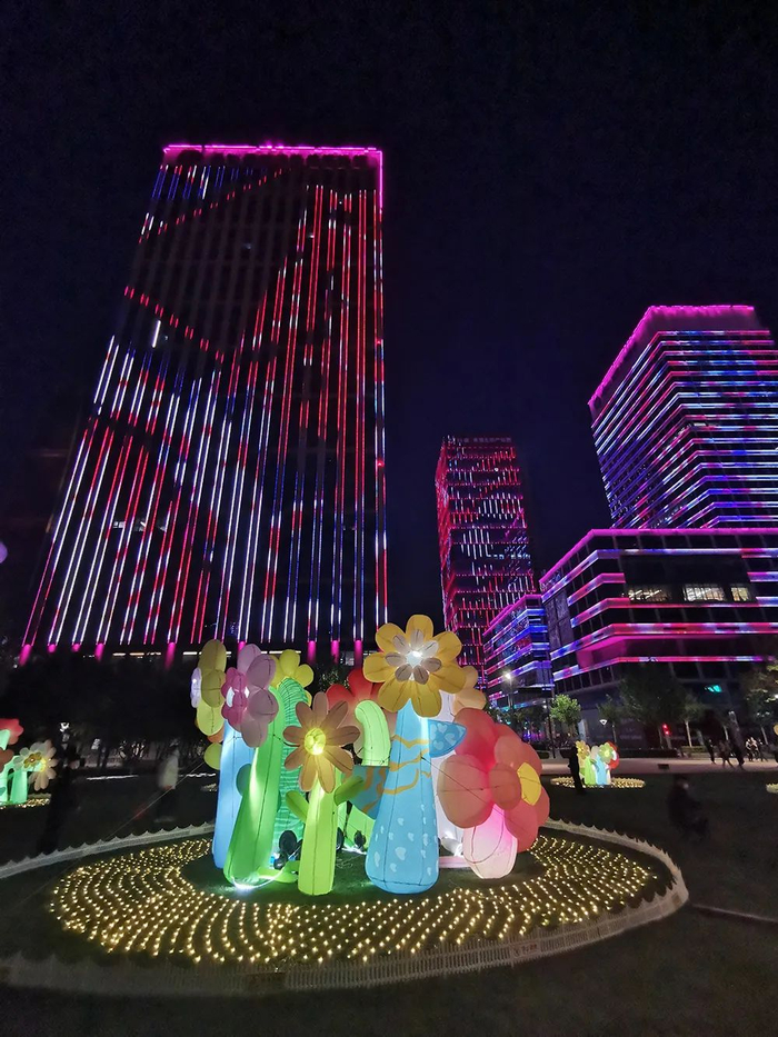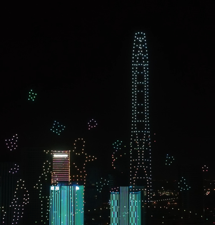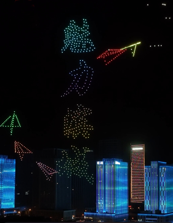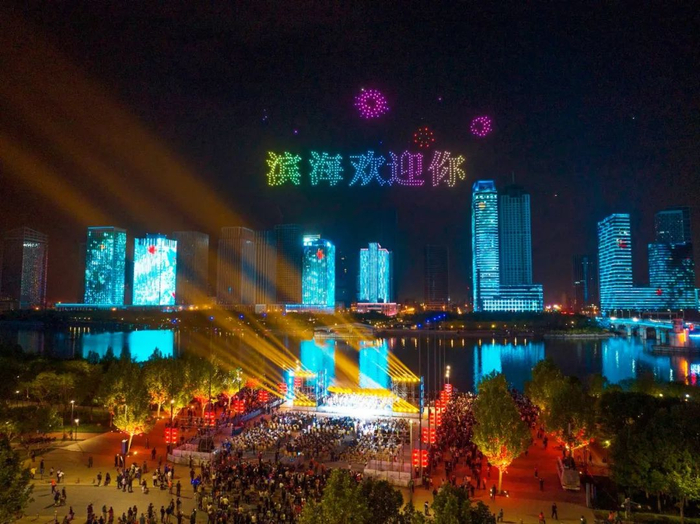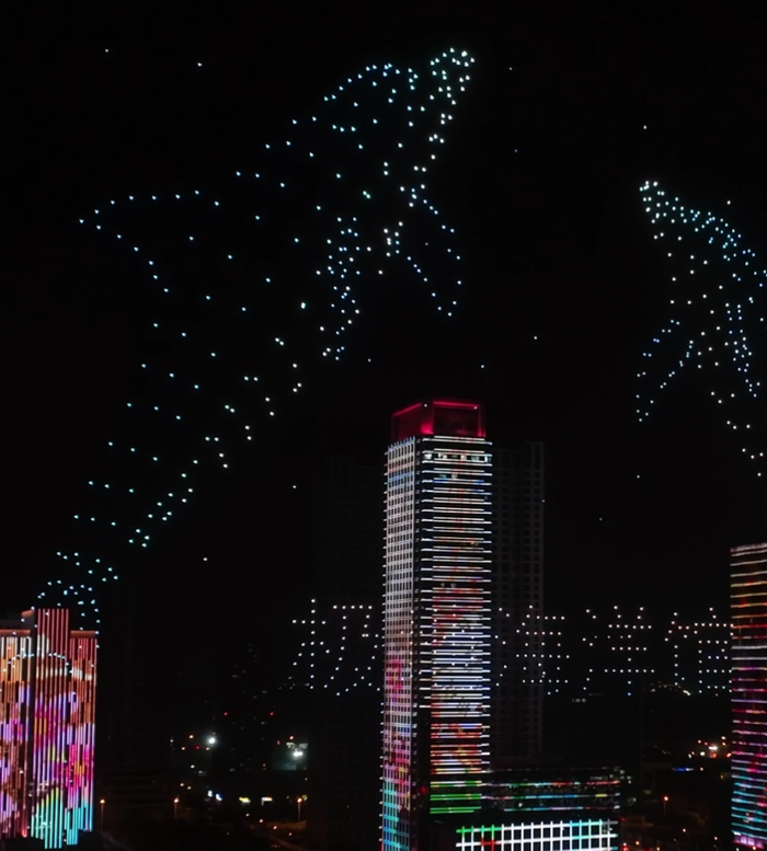 伴随着激情澎湃的交响乐,泰达企业一飞智控的千架无人机编队升空与古典音乐同步起舞,艺术与科技在这一刻完美融合。以天为幕,以城为景,用科技为“笔”,“飞”耀“于响”。只见无人机编队起飞后展开面阵向前飘动,汇聚成正方体动态旋转,随后陆续绘就出向海乐活节主题字样,滨海新区多处地标建筑动态刷光流动,画面千变万化,行云流水。游客纷纷举起手机、相机,记录下这一精彩瞬间。变幻的光影、生动的画面,在这场引人入胜的无人机表演秀之下,夜也显得格外缤纷浪漫,点亮泰达“于响”璀璨夜空。