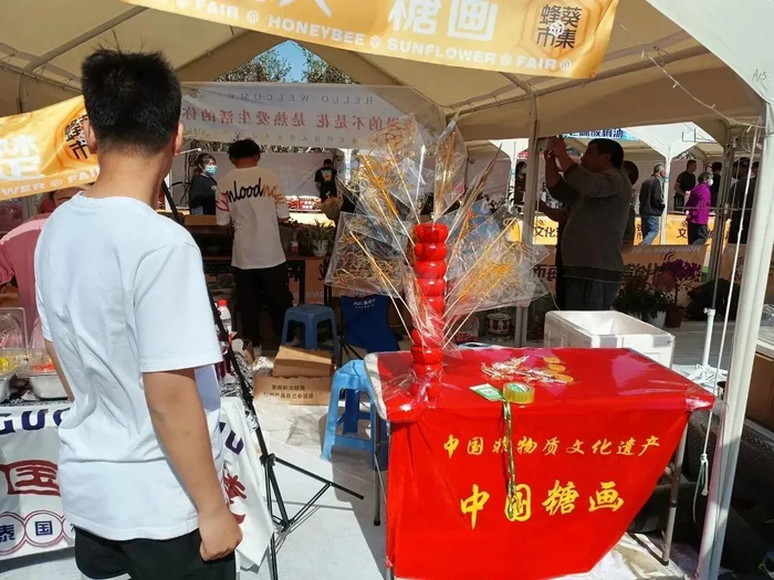 打造特色文化市集,自然也少不了传统文化的加持。在文旅板块,吹糖人、捏面人、画折扇等传统技艺集中亮相,联手为市民带来最熟悉的“老味道”。