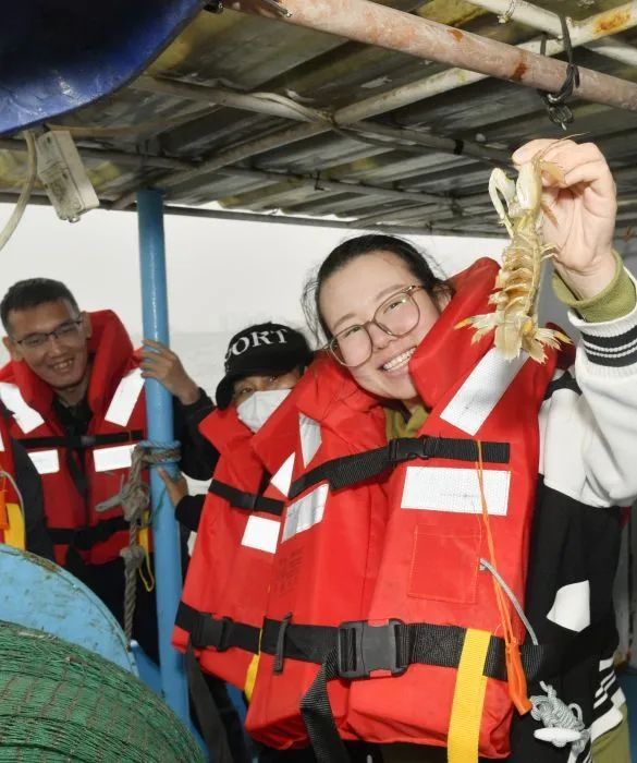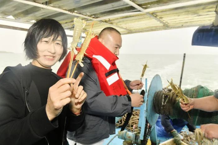 游船缓缓而行,渔民利落地撒下一网。游客们第一次近距离接触,新鲜感十足。皮皮虾、八爪鱼、蛤蜊、海螺等各式各样的海鲜,令游客们收获感满满。有的游客兴奋地拿起鲜活的海鲜端详、拍照,有的则忍不住将一些新鲜海货串成串,迫不及待地品尝大海的味道。