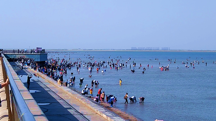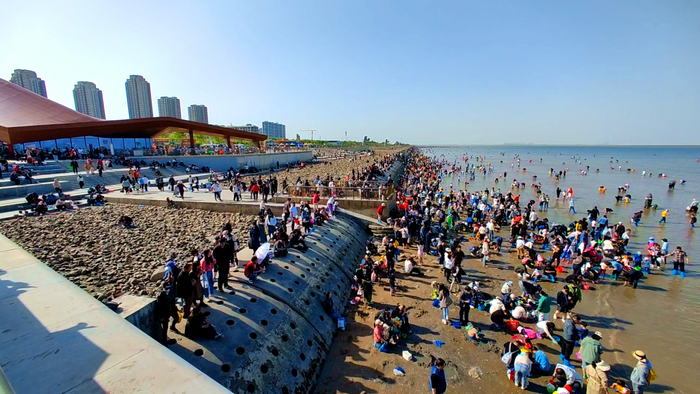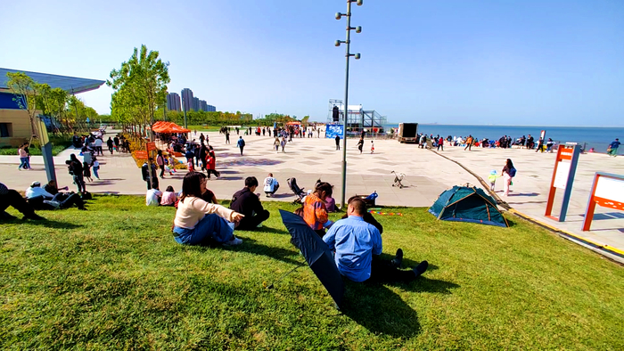 在亲海公园可以看到,游人如织,堆沙堡、赶海拾贝,全家组团来玩。来自北京大兴的游客王先生一家7口人,4月29日早上6点多从家中出发,开车2个多小时到达天津滨海新区,第一站就来到东疆亲海公园。“坐在这边吹着海风,感觉特别惬意。这里还有演出,有儿童游玩场所,还能拾贝壳,这次全家玩得都挺开心。”