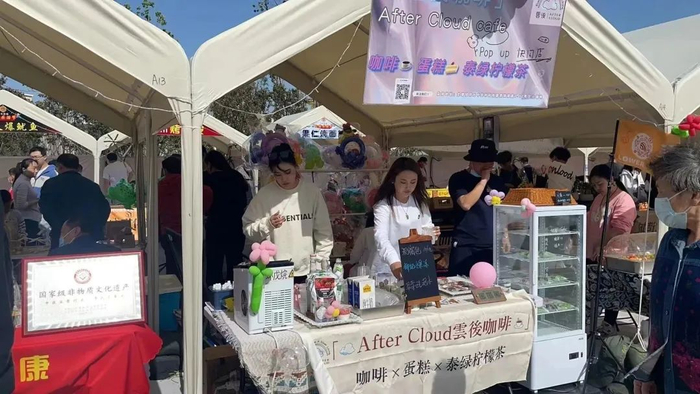 在美食区,市民刘女士一手端着手作咖啡,一手举着蒙古烤肉,吃得正起劲儿。“我就住在附近,中午路过时看见正在布置,放下车特意来逛逛。今年‘五一’假期没安排出行计划,没想到家门口也能有这样的主题街区,很不错。”刘女士说。
