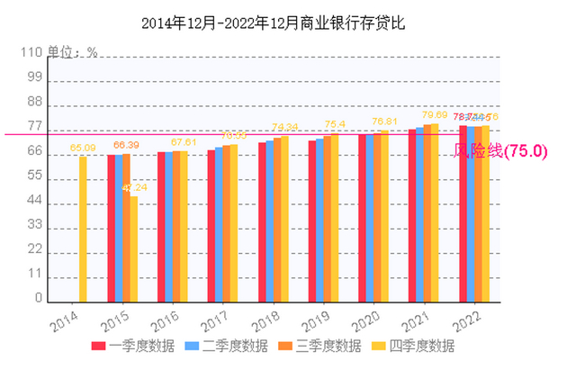 从负债方面看,我们同样不可小视。中国商业银行的存款虽然很好,但近年来由于理财、资管分流,存款利率的下降等因素,存款增长乏力已经很明显了。而且存款大多是活期存款和1-3年定期存款。相比较资产的期限,短借长贷的趋势更加明显,而且存款是可以自由流动的,一旦大量提取就会造成资产负债表的失衡。从存贷款比例来看,2015年到2022年,中国商业银行的存贷比连续攀升,从71.1%商业银行存贷比上升为78.76%。如相比10多年前,存贷比上升了10多个百分点。虽然监管部门取消了存贷比这个考核,但75%约束指标,是说明银行流动性的一个关键标志。随着经济的复苏,存贷比必然会上升,那时银行的流动性就会受压,资产负债的平衡会出现问题。