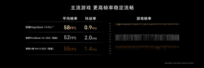 值得一说的是,在某游戏中,荣耀Magicbook 14 Pro的平均帧率达到58帧,抖动率仅为0.9毫秒,而友商平均帧率则最高为55帧,在酣畅开黑的时候,不用担心掉帧和卡顿。此次新品在争霸赛上的表现就可见一斑。