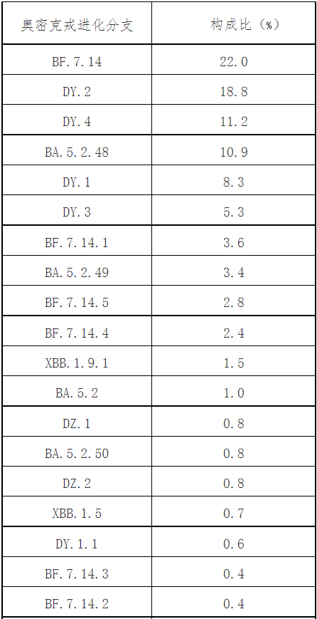 (二)12月以来本土病例病毒变异株监测情况。2022年12月1日至2023年4月27日,全国共报送35089例本土病例新冠病毒基因组有效序列,均为奥密克戎变异株,涵盖134个进化分支。主要流行株为BA.5.2及其亚分支(构成比62.2%)和BF.7及其亚分支(构成比32.3%)等。其中,BA.5.2及其亚分支包括DY.2(18.8%)、DY.4(11.2%)、BA.5.2.48(10.9%)、DY.1(8.3%)、DY.3(5.3%)和BA.5.2.49(3.4%)等;BF.7及其亚分支包括BF.7.14(22.0%)、BF.7.14.1(3.6%)、BF.7.14.5(2.8%)、BF.7.14.4(2.4%)、BF.7.14.3(0.4%)和BF.7.14.2(0.4%)等(表4-1)。共监测到本土重点关注变异株1527例,其中,4例BQ.1、5例BQ.1.1、34例BQ.1.1.13、1例BQ.1.1.17、1例BQ.1.1.18、1例BQ.1.1.35、1例BQ.1.1.38、1例BQ.1.1.46、1例BQ.1.1.53、2例BQ.1.1.66、1例BQ.1.1.69、8例BQ.1.2、1例BQ.1.23、2例BQ.1.8、2例CH.1.1、6例CH.1.1.1、1例CH.1.1.11、2例CH.1.1.17、1例DT.2、1例EA.1、4例EG.1、3例EL.1、7例EM.1、1例ET.1、10例EU.1.1、3例FB.1、1例FD.2、6例FE.1、7例XBB、6例XBB.1、5例XBB.1.11.1、1例XBB.1.12、13例XBB.1.15、116例XBB.1.16、43例XBB.1.16.1、21例XBB.1.17.1、1例XBB.1.19、70例XBB.1.19.1、5例XBB.1.22、103例XBB.1.22.1、2例XBB.1.22.2、1例XBB.1.23、10例XBB.1.24、1例XBB.1.4、248例XBB.1.5、1例XBB.1.5.1、6例XBB.1.5.11、16例XBB.1.5.12、1例XBB.1.5.13、35例XBB.1.5.15、2例XBB.1.5.16、2例XBB.1.5.17、1例XBB.1.5.2、1例XBB.1.5.20、1例XBB.1.5.21、8例XBB.1.5.23、51例XBB.1.5.24、1例XBB.1.5.28、2例XBB.1.5.32、5例XBB.1.5.35、2例XBB.1.5.36、1例XBB.1.5.5、3例XBB.1.5.7、2例XBB.1.9、540例XBB.1.9.1、53例XBB.1.9.2、1例XBB.1.9.3、1例XBB.1.9.5、23例XBB.2.3、1例XBB.2.3.2、1例XBB.2.4、2例XBB.3。