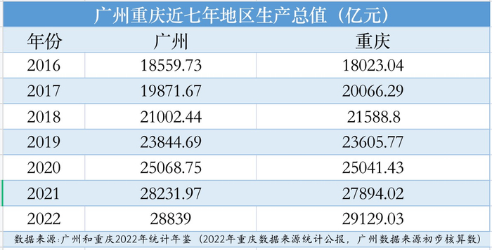 2016年-2022年近7年的广州和重庆的统计年鉴数据显示,2017年和2018年,重庆超过广州,分别领先194.62亿和586.36亿元;2019年、2020年和2021年,广州又反超重庆,分别高出238.92亿、27.32亿和337.95亿元。2022年,重庆又再次超过广州。