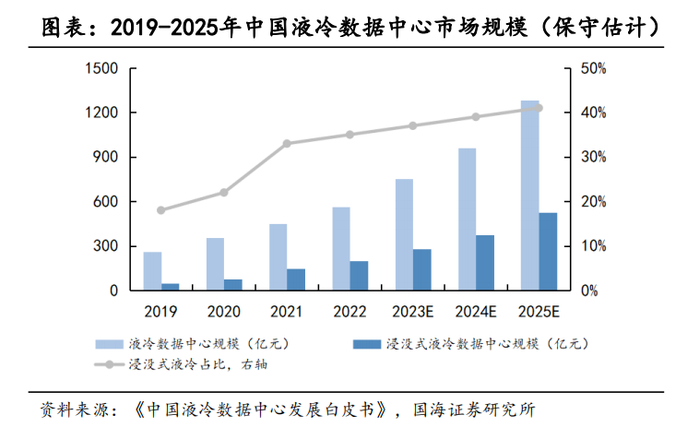 国海证券分析师李永磊等4月11日研报指出,人工智能技术的迅猛发展,极大增加了相关产业对高性能算力的需求,而在高性能算力的背后,对设备散热冷却提出了更高的要求。根据《中国液冷数据中心发展白皮书》数据,保守估计2025年中国液冷数据中心市场规模1283.2亿元,其中浸没式液冷市场占526.1亿元,占比将超过40%。