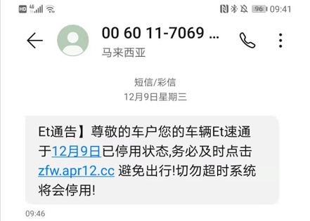 【通告】尊敬的车户您的车辆ETC速通于9月9日已停用状态,务必及时点击 ***.***.cc 避免出行!切勿超时系统将会停用!