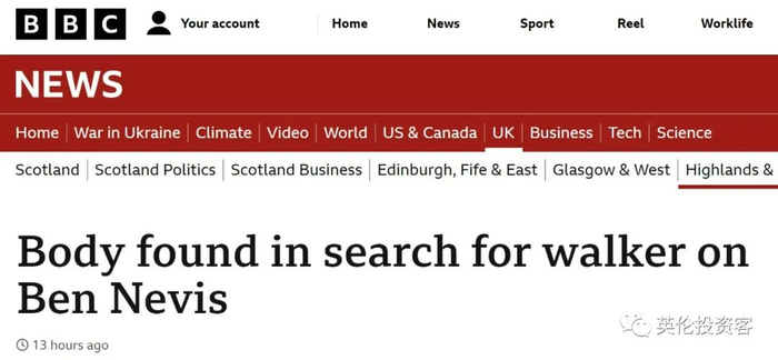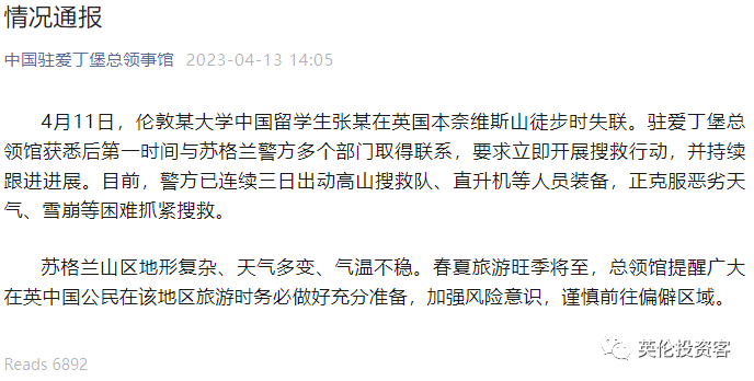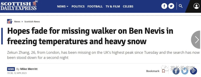 当地时间4月13日,中国驻爱丁堡总领事馆在公众号上通报称,张泽坤在英国苏格兰本奈韦斯山(Ben Nevis)徒步时失踪。