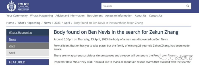 根据苏格兰警方当天发布的警情通告,警方在当地时间4月13日下午3:30于事发地点发现了一具男性遗体,并将此消息传达给了张同学的父母。