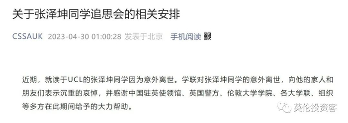 学联对张泽坤的意外离世,向他的家人和朋友们表示沉重的哀悼,并感谢中国驻英使领馆、英国警方、伦敦大学学院、各大学联、组织等多方在此期间给予的大力帮助。