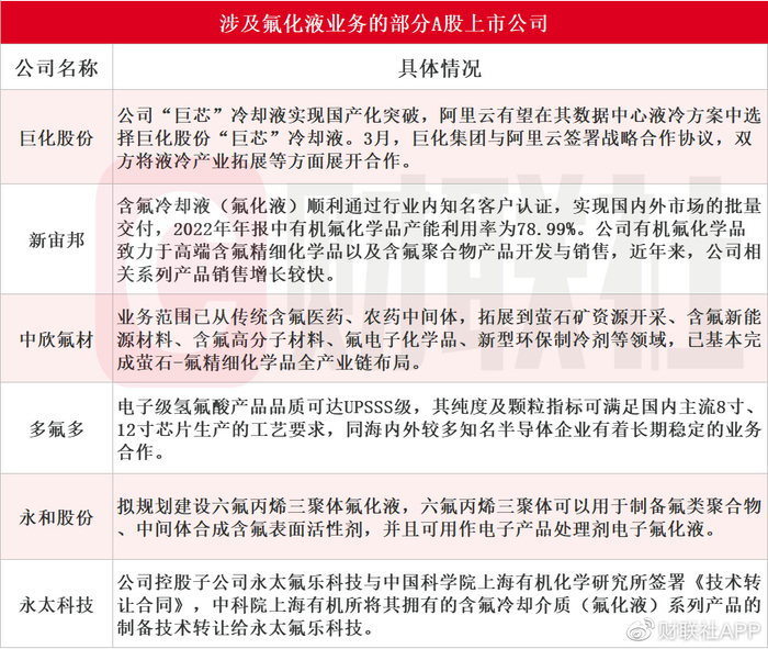 据财联社不完全统计,涉及氟化液业务的A股上市公司包括巨化股份、新宙邦、中欣氟材、多氟多、永和股份、永太科技等,具体情况如下: