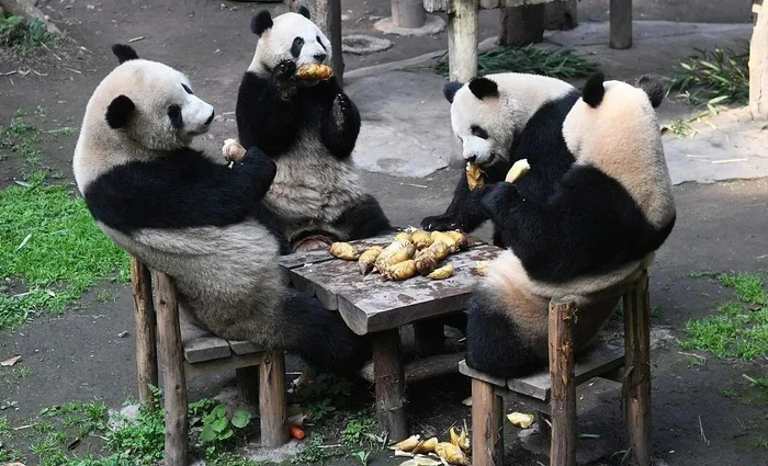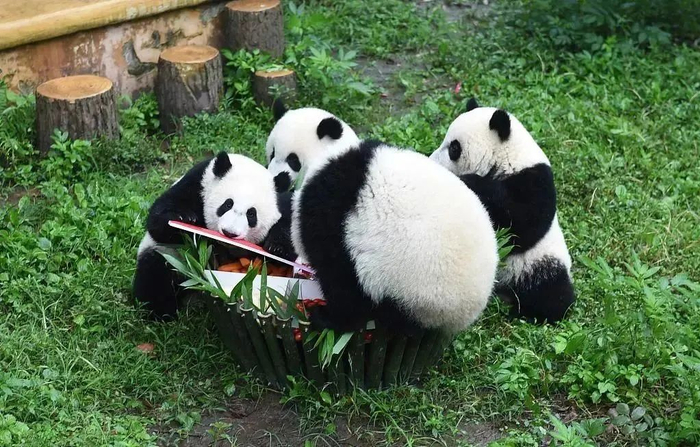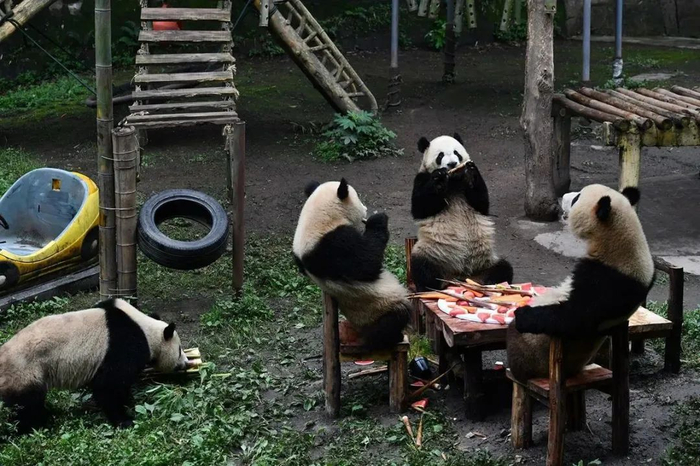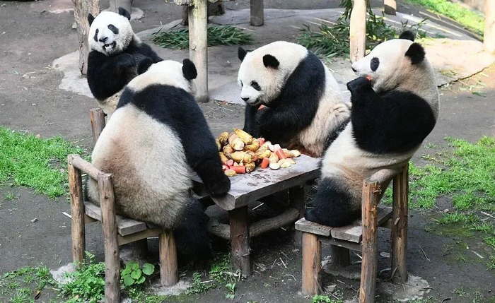 2022年6月10日,重庆动物园,“双双”“重重”“喜喜”“庆庆”在当日为他们举办的3周岁生日会上围坐一圈享用美食。IC 图