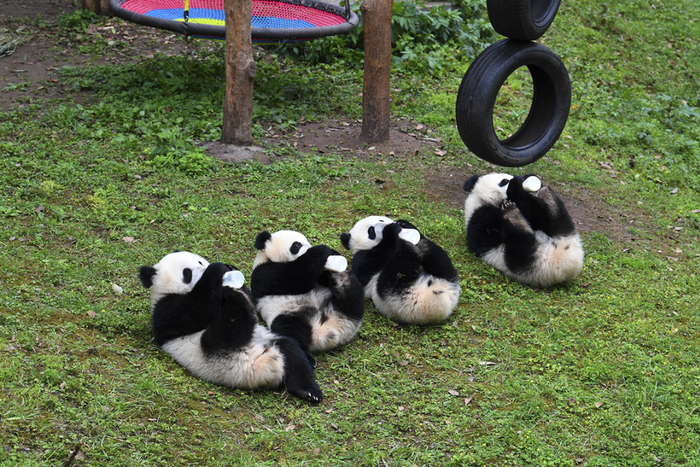 2020年4月4日,重庆动物园,“双双”“重重”“喜喜”“庆庆”这四只当时不足一岁的大熊猫幼仔躺在草地上,正在抱着奶瓶喝奶。IC 图