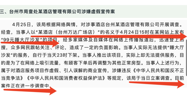 25日,台州市市场监管局根据网络舆情,对涉事的台州某酒店管理有限公司开展调查。经查,酒店实际无法提供“睡大厅沙发”服务,自行于24日23时下架。