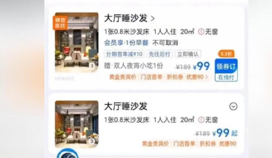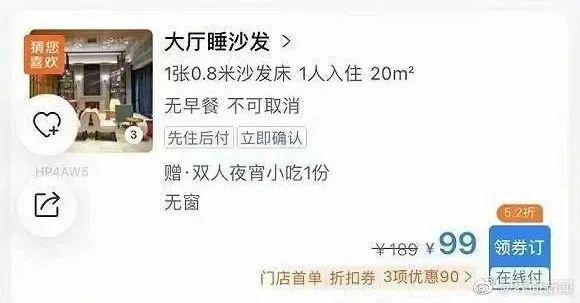 4月24日,台州某酒店在旅行平台上线“大厅睡沙发”产品,描述为“1张0.8米沙发床,99元一晚”,含早餐、夜宵,迅速引发热议。