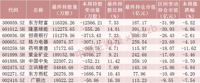 本周北向资金持仓市值减少额居前十的股票均被北向资金减仓,东方财富、招商银行、格力电器、紫金矿业、立讯精密、东方雨虹被减仓超1600万股。