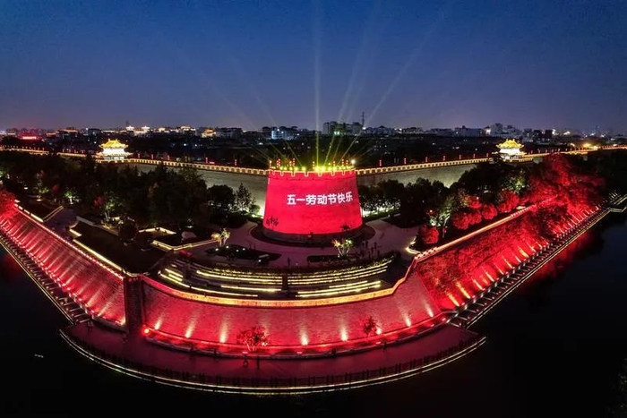 4月30日晚,西安城墙景区用璀璨的光影秀在西南城角、东南城角墙体上滚动展现“五一劳动节快乐”“以劳动圆梦 以奋斗起航”“劳动创造幸福 实干创造伟业”字样,在营造欢乐、祥和的节日氛围的同时,向广大的劳动者致以最崇高的敬意。(记者 李明)