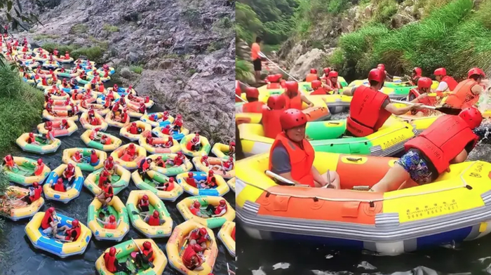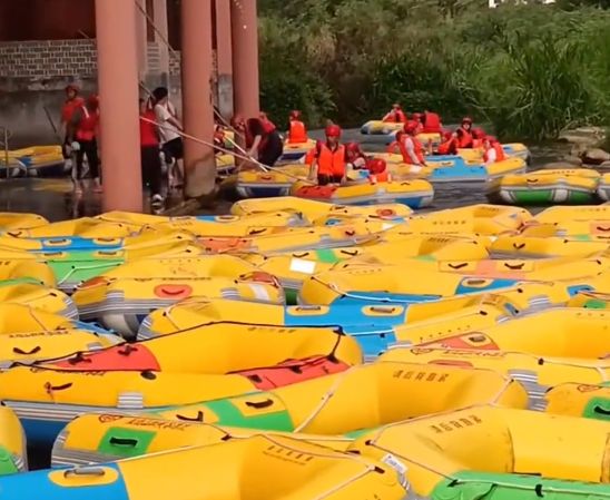 4月29日,海南五指山红峡谷漂流河段出现“"堵船”场景,船挨船根本漂不动,网友调侃到,漂流船变碰碰船。