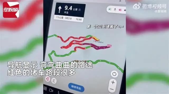 导航显示,弯弯曲曲的路途,红色的堵车路段很多,有一段直接堵成紫色,女子吐槽“第一次见”。