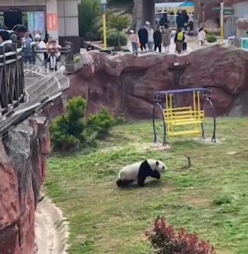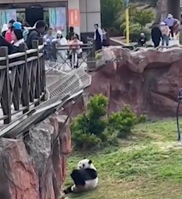 4月29日,网友发视频称,有游客在江苏盐城大丰港动物园,给大熊猫震生投喂可乐,它咬破瓶子可乐喷出被吓到。