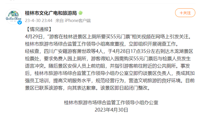 4月30日深夜,桂林市文化广电和旅游局通报称,木龙湖景区即日起闭门整改。