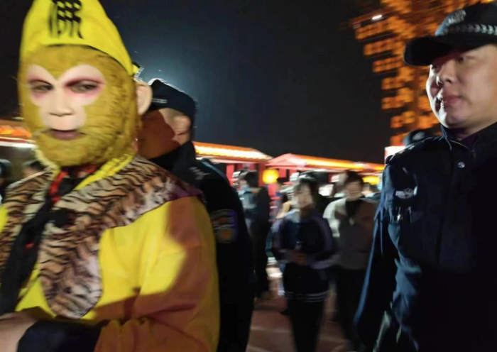 在不夜城内,三名打扮成孙悟空、僵尸形象的人,专门拦住带小孩的游客合影,拍了照,不给钱,那“猴哥”就一直跟着你,一直跟了二、三十米,最后被迫给二十元才得以脱身;还有的“猴哥”主动跟孩子合影后拉着小孩的手腕跟家长要钱,吓哭好几个孩子。