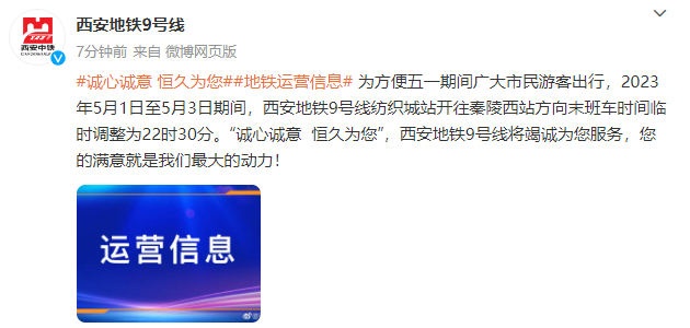 据了解,5月1日至5月3日期间,西安地铁9号线纺织城站开往秦陵西站方向末班车时间临时调整为22时30分。