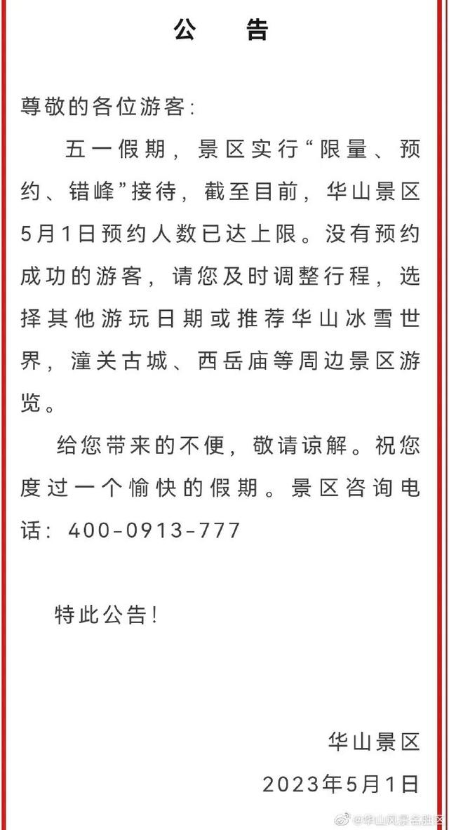 华山风景名胜区发布消息称,五一假期,景区实行“限量、预约、错峰”接待,截至目前,华山景区5月1日预约人数已达上限。没有预约成功的游客,请您及时调整行程,选择其他游玩日期或推荐华山冰雪世界,潼关古城、西岳庙等周边景区游览。