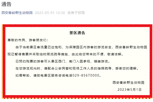同时,记者从西安秦岭野生动物园官方账号了解到,由于当前景区客流量已达饱和,为保障园区内游客的游览安全,西安秦岭野生动物园现已暂停售票并采取临时限流疏导措施。