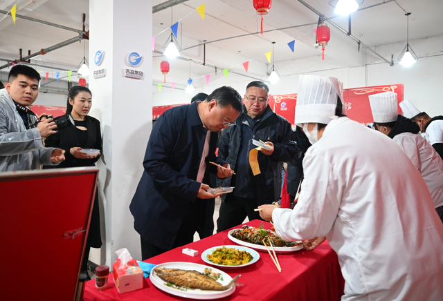 服务区内,改刀、配料、上灶台,厨师们在灶台前忙得不亦乐乎。红烧丁桂鱼、刺老芽煎蛋、清蒸边花鱼、拌柳蒿芽等绿色无污染的山野菜成了厨师们制作美味的上好食材。经过多个小时的准备,27道菜新鲜出炉,现场旅客也纷纷拿起筷子,品尝这些极具本地特色的鲜鱼、野菜。