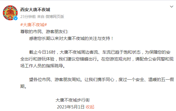 感谢您长期以来对大唐不夜城的关注与支持!截止今日16时,大唐不夜城周边客流、车流已趋于饱和状态,为保障您的安全出行和游玩体验,我们建议您错峰出行。