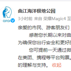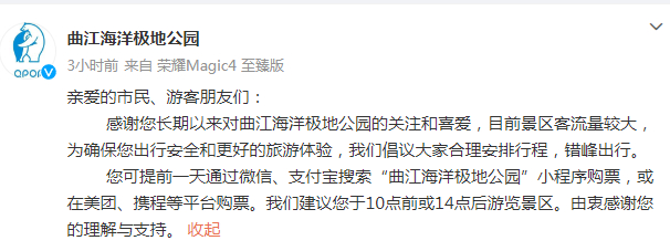 感谢您长期以来对曲江海洋极地公园的关注和喜爱,目前景区客流量较大,为确保您出行安全和更好的旅游体验,我们倡议大家合理安排行程,错峰出行。