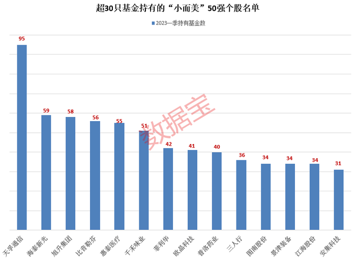 “小而美”50强机构关注度较高,获得较多家券商机构评级的同时,也备受基金喜爱。50强个股在一季度均有基金重仓,持仓基金数最多的是天孚通信,一季度共有95只基金扎堆重仓,合计持股占流通股比例12.3%。旭升集团、比音勒芬、海泰新光、惠泰医疗、千禾味业一季度均获得超50只基金重仓。