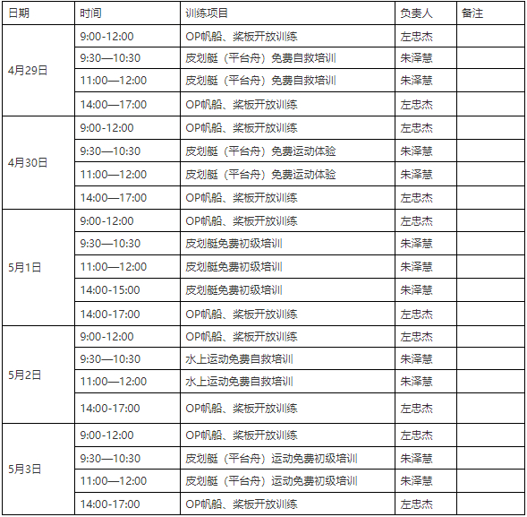 注:免费对市民开放项目为:皮划艇(平台舟)水上自救培训、运动体验