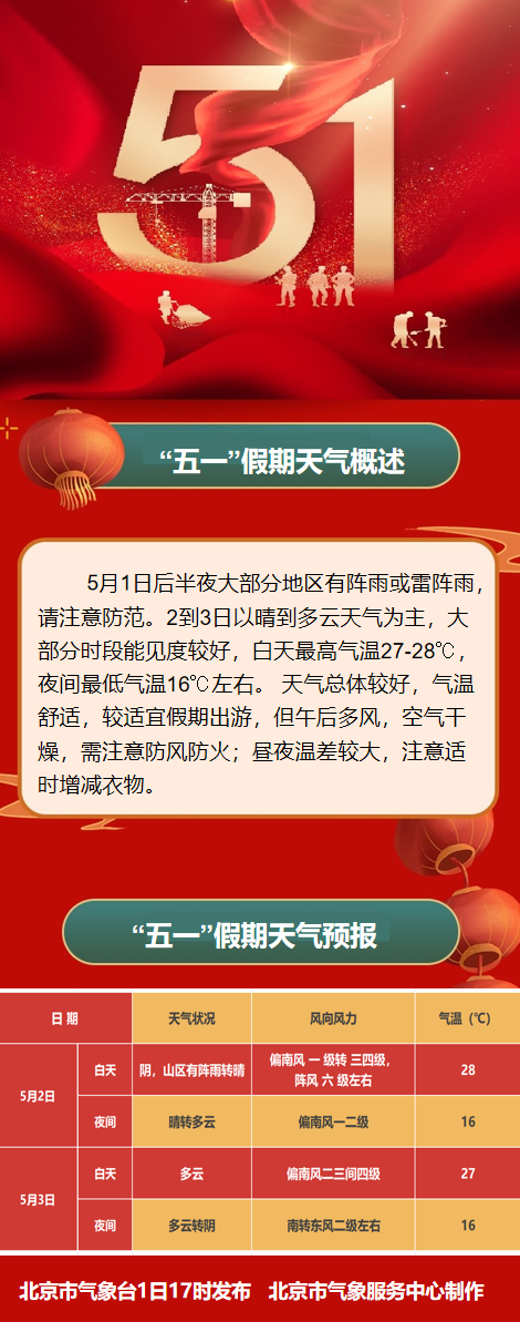 五一假期过半,北京今天后半夜大部分地区将有阵雨或雷阵雨