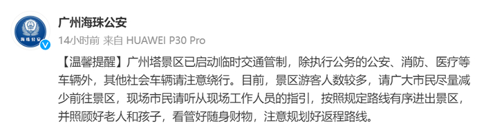 海珠区提醒:尽量减少前往广州塔景区,现场市民请听从现场工作人员的指引,按照规定路线有序进出景区,并照顾好老人和孩子,看管好随身财物,注意规划好返程路线。