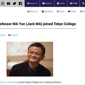日本东京大学官网消息,聘请阿里巴巴创始人马云为“东京学院(Tokyo College)”客座教授。