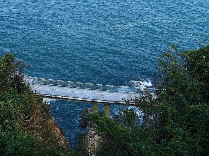 海水的蔚蓝、天空的清透和栈道的白色