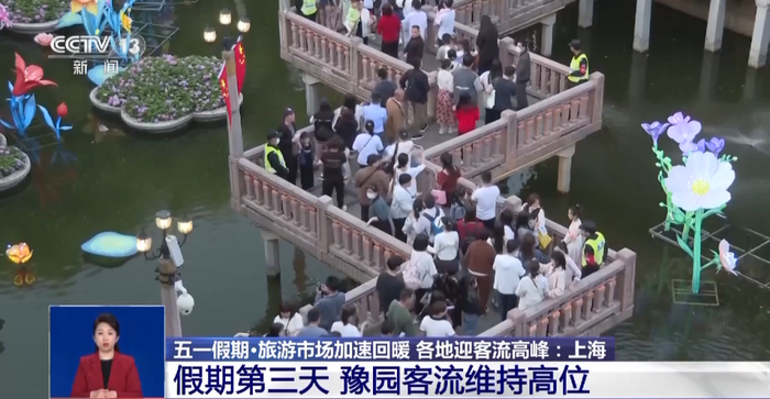 总台记者 魏然:一整天下来,来豫园的游客们的参观热情丝毫不减。在九曲桥上,游客摩肩接踵。警方在上桥处专门设置了蛇形通道控制客流,且从南至北单向通行,确保游客们在桥上的安全。这个五一假期,豫园的游客数量相较平时有了三四倍的增长。