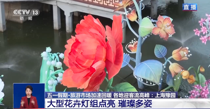 豫园这座江南园林位于上海的闹市区,飞檐翘角、亭台楼阁,遍布其间,人们来到这里观光,主要还是想看看上海最传统的那一面。现在,天色渐暗,可以看到九曲桥已经被湖面上的大型花卉灯组点亮。仔细看,这其中有很多奇花异草的造型,它们的设计灵感,来源于古代神话《山海经》。同时,花卉灯组里也有春日盛放的牡丹,寓意着盛世安康,还有海棠、康乃馨等一系列花景,吸引大家在桥上驻足拍照留念。老城厢的古朴与黄浦江对岸陆家嘴的摩天大楼,同框出现,相映成趣。