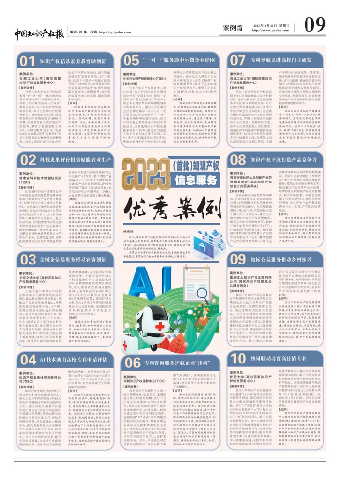 编者按:近日,国家知识产权局发布2023年首批20个知识产权信息服务优秀案例,集中展示了技术与创新支持中心(TISC)、高校国家知识产权信息服务中心、国家知识产权信息公共服务网点的好经验、好做法。