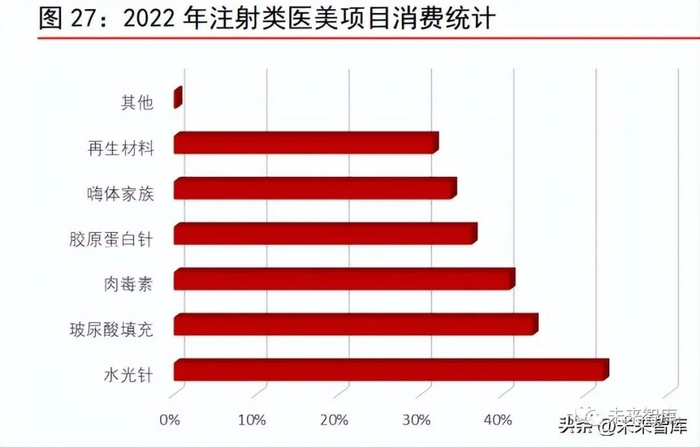玻尿酸应用广泛,再生材料增速亮眼。根据艾瑞咨询调研数据,艾瑞咨询调研医 美用户中,2022 年有超过 52%的用户注射过水光针,有 43.6%的用户曾注射填充 类玻尿酸,有四成以上用户注射过肉毒素。目前,玻尿酸用途已经从面部的填充 塑形和补水保湿,逐步扩大至精灵耳、直角肩的塑造,并且在垫臀等其他方向已 有初步尝试。增速方面,援引艾瑞咨询发布的《2022 年中国医疗美容行业研究报 告》中 ISAPS 的数据,2020 年,全球注射类材料整体治疗次数较 2016 年增长 24.1%;其中,再生材料 PLLA 同期增速高达 52.0%,而羟基磷灰石、肉毒素、玻尿酸的同 期增速分别为 35.1%、26.0%和 20.2%。我们认为,以童颜针和少女针为代表的再 生材料针剂,已将轻医美市场从填充时代推向再生时代。