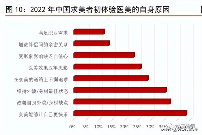 我国多数人进行医美消费是为了取悦自己。艾瑞咨询调研数据显示,2022 年,我国大部 分医美用户进行医美消费的初衷都是处于自身原因。其中,超过四成医美用户认为变美 可以让自己更快乐,超三成用户认为医美可以改善自身外貌缺点,帮助自己维持外貌最 佳状态。同时,也有部分国人是在社会或他人影响下尝试医美。总体来看,多数人的医 美出发点是出于自身对变美的追求,具备主观能动性和可持续性,这也侧面反映出医美 用户的较高粘性。