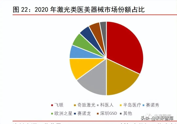 我国激光类医美器械中,中资品牌占比超七成。目前,市场上常见的激光类医美器械中, 中资品牌包括飞顿、奇致激光、半岛医疗、欧洲之星和深圳 GSD 等,进口品牌有科医人、 赛诺秀、赛诺龙等。一方面,资本市场通过兼并收购的方式推动激光类医美器械国产替 代进程,复锐医疗科技在 2013 年收购飞顿,汉德资本在 2017 年收购欧洲之星 Fotona。另一方面,国产品牌不断加强研发创新,奇致激光、半岛医疗等本土品牌崭露头角。根 据艾瑞咨询发布的《2022 年中国医疗美容行业研究报告》,2020 年我国激光类医美器 械市场份额最高的是飞顿,占比高达 32%;其次是奇致激光、科医人、半岛医疗,对应 市场份额分别为 18%、15%和 10%。
