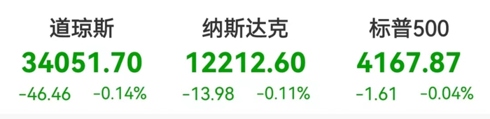 当地时间5月1日,美股三大股指小幅收跌,道指跌46.46点,跌幅为0.14%,报34051.70点;纳指跌13.98点,跌幅为0.11%,报12212.60点;标普500指数跌1.61点,跌幅为0.04%,报4167.87点。