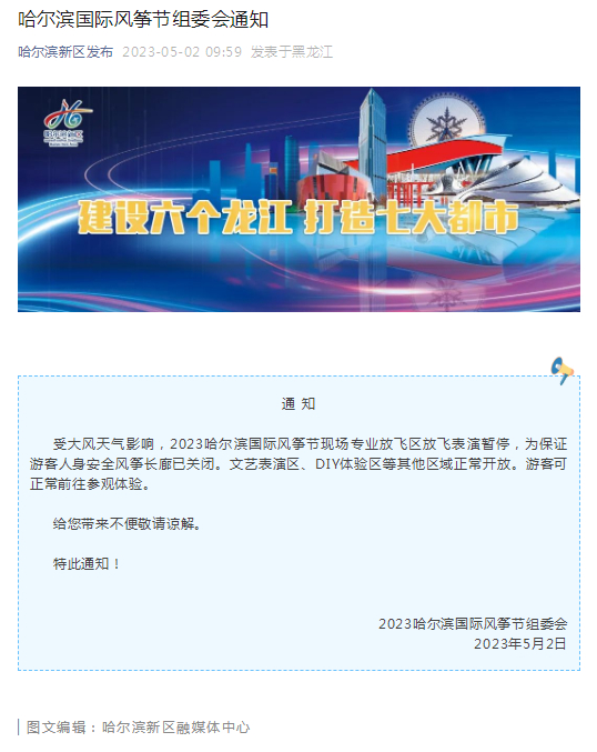 哈尔滨国际风筝节组委会:受大风天气影响 放飞表演暂停