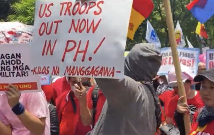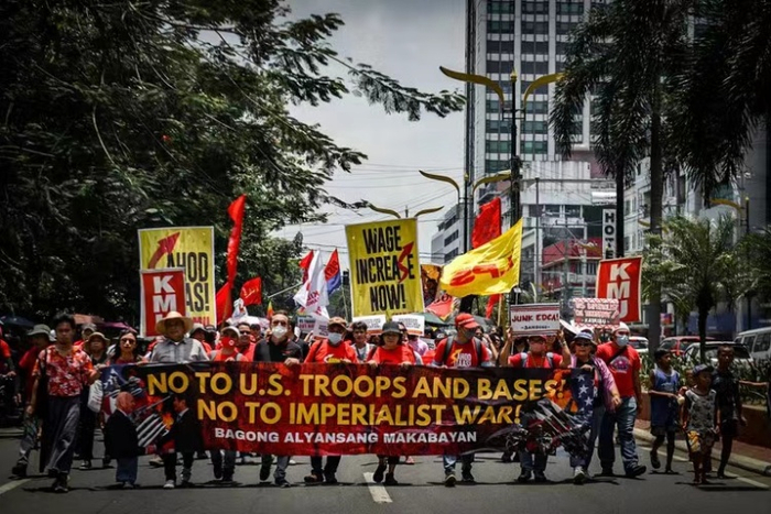 根据外媒发布的抗议现场照片及视频,数百名菲律宾抗议者5月1日抗议向美军开放更多在菲律宾的军事基地。