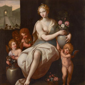 芙罗拉是古罗马神话里的花神,经常被人们认为是希腊神话中花神克罗莉斯的化身,这个主题深受波提切利、普桑等画家的喜爱。该主题逐渐从神话画中剥离出来,成为单独的女神像主题,之后又以“扮演芙罗拉的女性”肖像画的形式出现,描绘手持鲜花的年轻女性。提香·韦切利奥的作品和伦勃朗描绘妻子莎斯齐亚的作品就是这一主题的代表作。此作品中芙罗拉怀抱花瓶,身体扭向一侧,双眼目视前方,似乎正与观者交流。她的身旁还围绕着四个形态各异的天使,其形象原型即源自于古罗马神话中的丘比特。通观画作,虽略有形式主义,且描绘得不够深刻,但它却有着些许文艺复兴时期所特有的韵味,以及考究的法国绘画所特有的样式主义明艳之美。