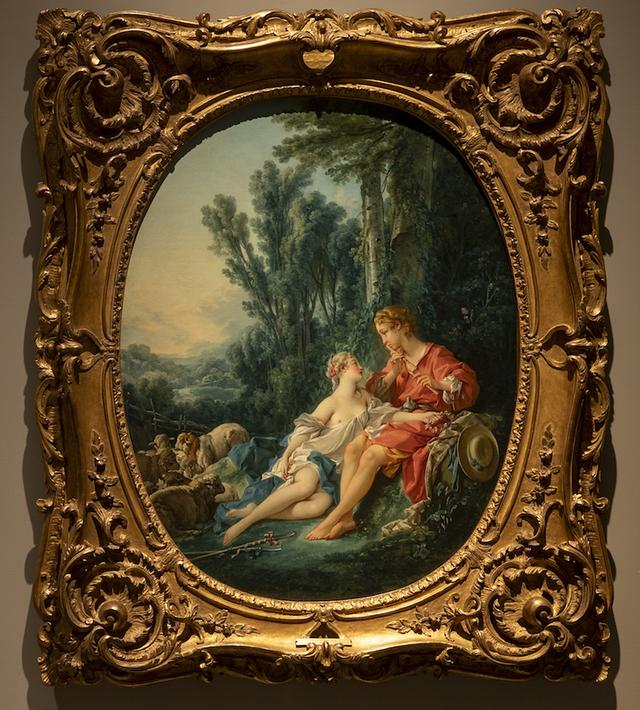 布歇从1742年起开始制作将田园爱好与神话画相结合的小型作品。在展厅的另一幅作品中,描绘的温情脉脉的场景仿佛田园牧歌一般,引入遐想联翩,反映了当时人们渴望逃离现实的理想主义场景,也是社会普遍对于爱情的追求和美好幻想。
