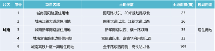 城南片区居住用地包括郦阳路居住用地、江朗大道居住用地、新华南路居住用地、富康路南边居住用地、高铁片区一期居住用地等5宗,交通便捷,环境优美,周边教育医疗设施完善。